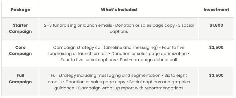 Starter Campaign2–3 fundraising or launch emails · Donation or sales page copy · 3 social captions$1,800