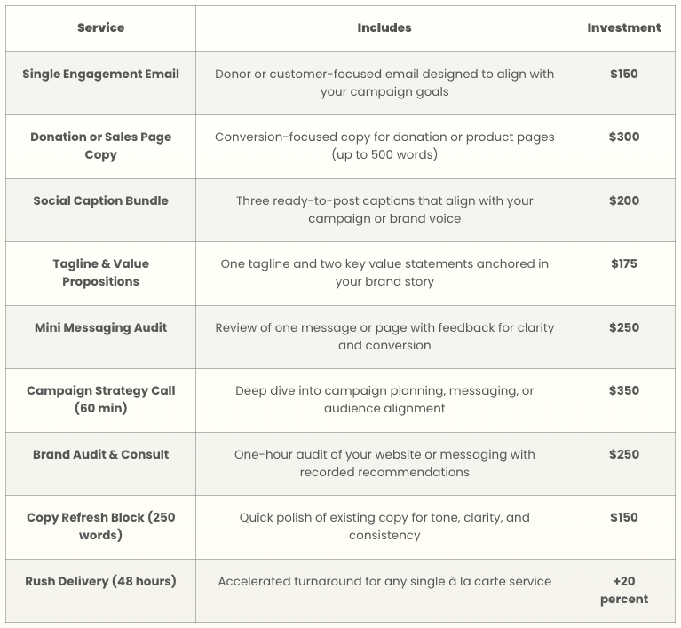 Core CampaignCampaign strategy call (timeline and messaging) • Four to five fundraising or launch emails • Donation or sales page optimization • Four to five social captions • Post-campaign debrief call$2,500